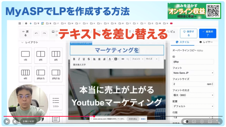 [02:44] 直感的なエディタで、変更したいテキストをクリックするだけで編集可能です。文字サイズの調整も簡単です。