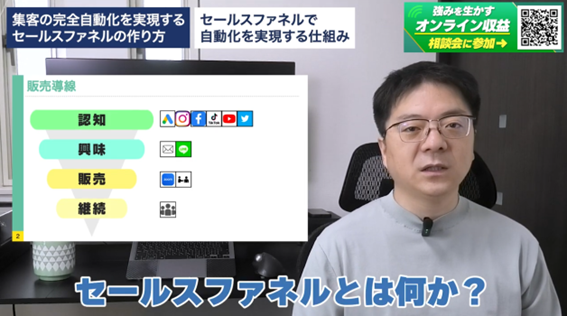 矢口さんも実践したセールスファネルとは、集客・教育・販売・継続を一貫して設計し、自動化する仕組みです。